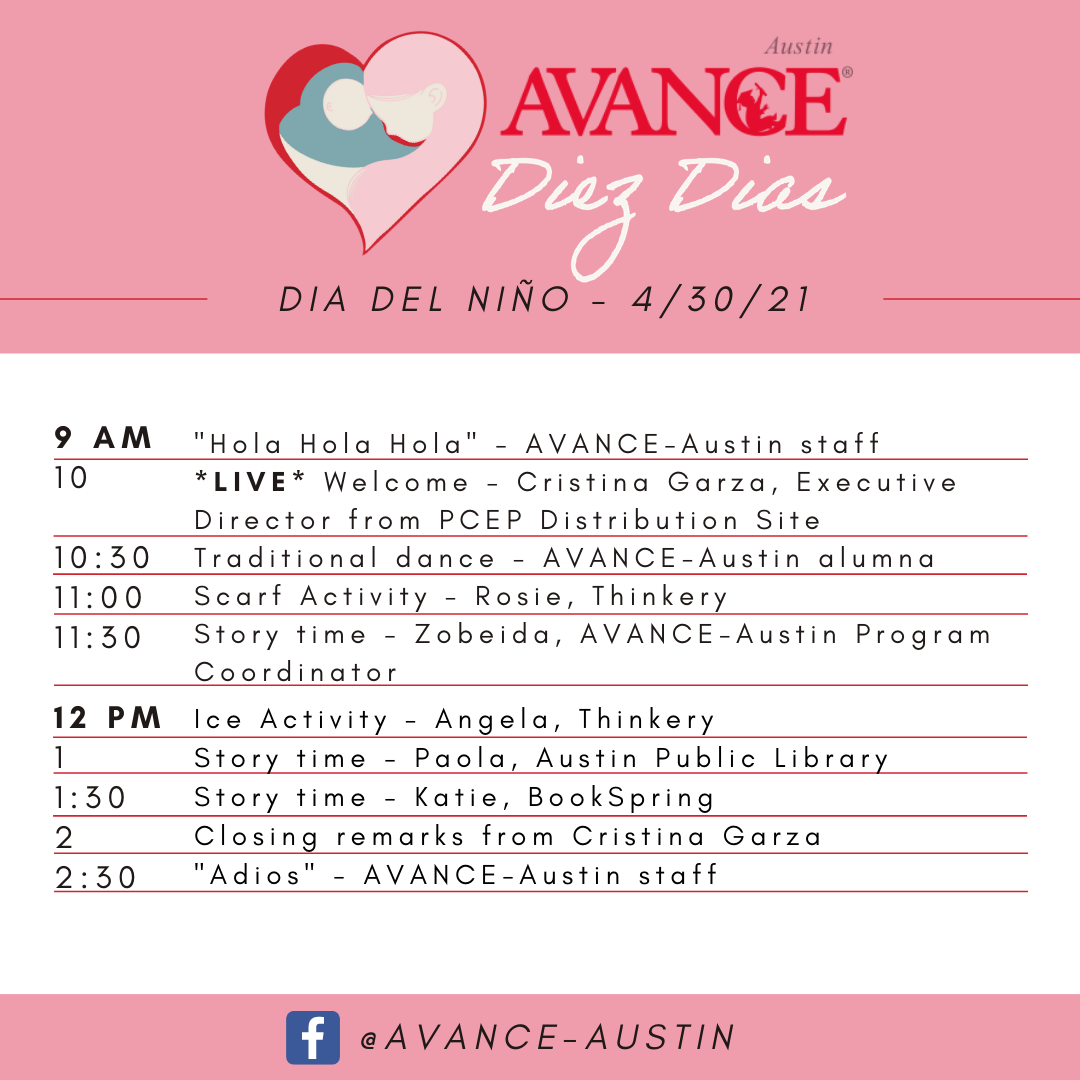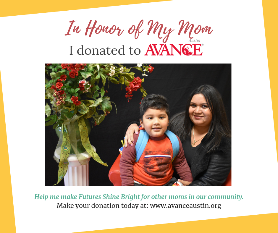 Hi friend! AVANCE-Austin is honoring mothers and their children in the first-ever AVANCE-Austin Diez Dias Celebration which begins on Dia de los Niños and ends on Dia de los Madres. You have helped me reach my fundraising goals in the past and I am so thankful for you. Will you please consider a gift today to help us reach our new goal of $25,000 this Spring 2021? And, now until May, every dollar donated will be MATCHED so your investment will be DOUBLED. Help me uplift our community by making a donation here: avanceaustin.org/support-us/donate