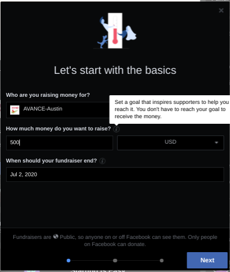 - Search for AVANCE-Austin and click on it. It will prompt you to set a dollar amount, and when to end the fundraiser.