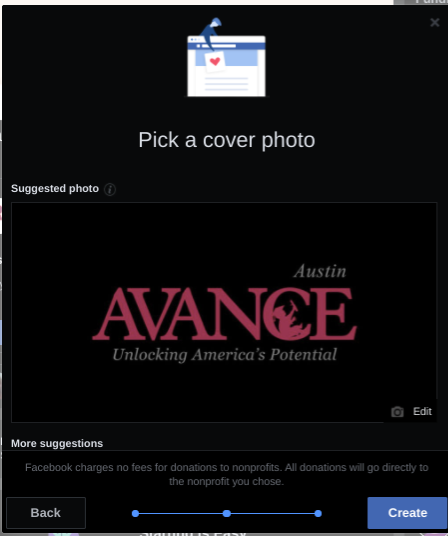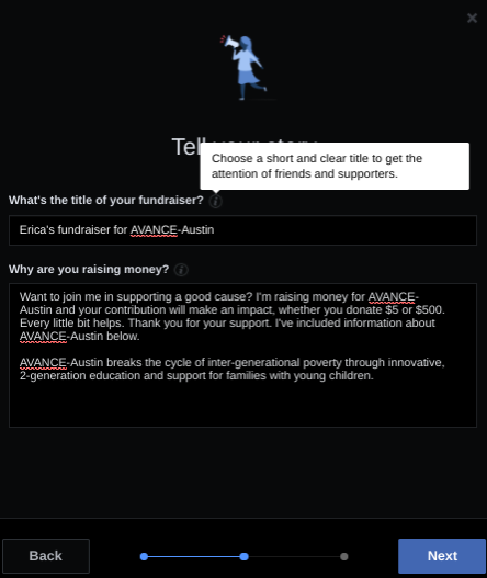 - Click next and you will be prompted to come up with a title and an explanation of why you are raising money for AVANCE-Austin. You can change or add what they have provided. The AVANCE mission statement can be found at the top of this document and impact results can be found on the AVANCE-Austin website at avanceaustin.org